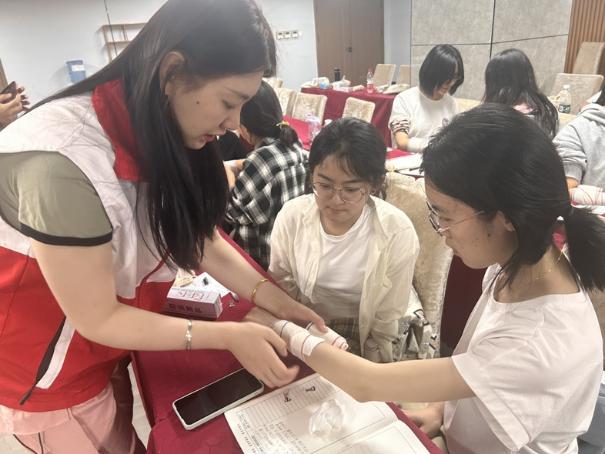 午后1:00,培训进入到了包扎技巧的学习阶段。教师细致地示范并解释了三种常用的绷带包扎方法:螺旋式、环状以及“8”字型包扎。学员们分组进行了练习,互相帮助,共同提升。
