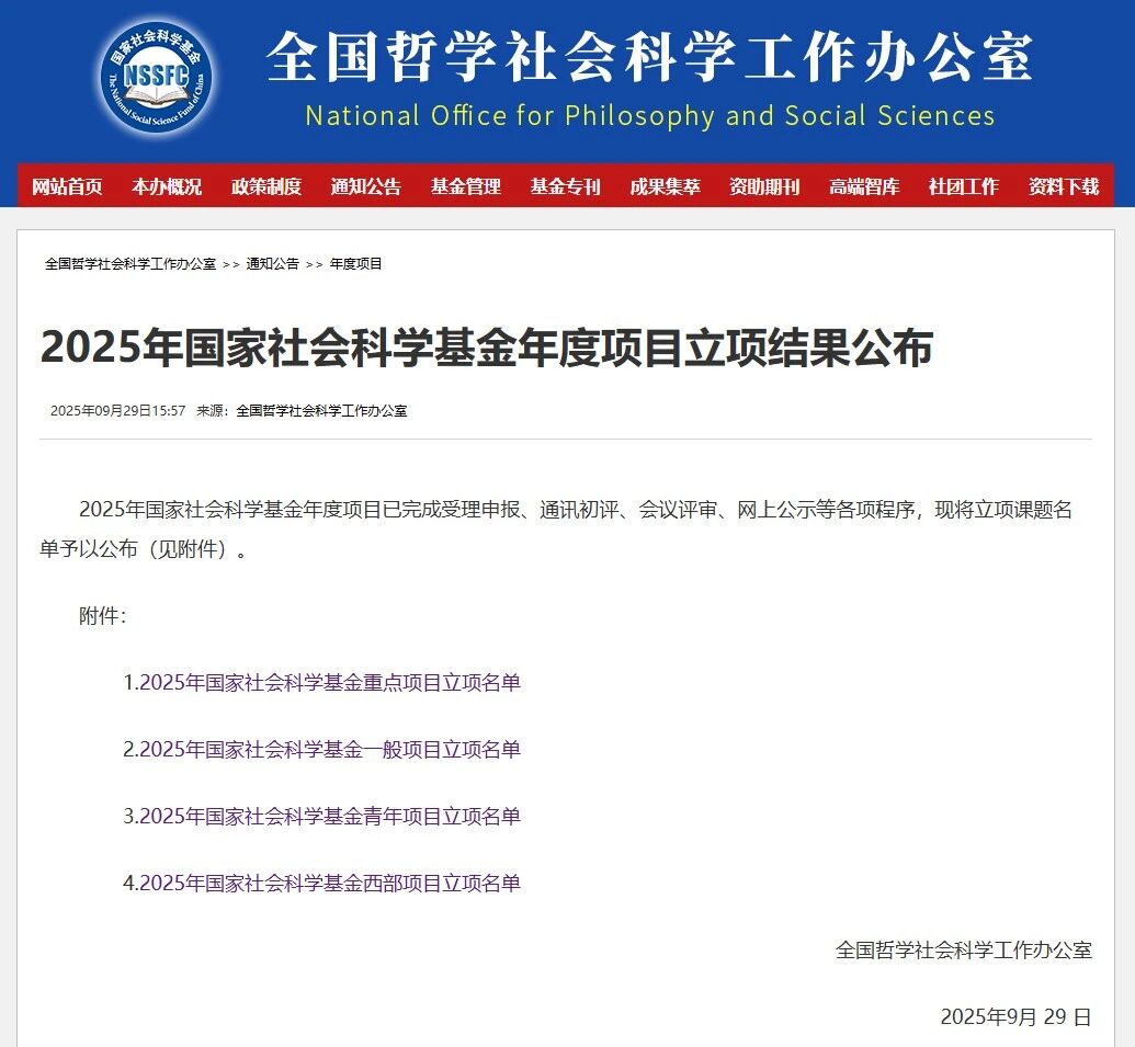 日前,全国哲学社会科学工作办公室正式公布2025年国家社会科学基金年度项目立项结果,一夜情