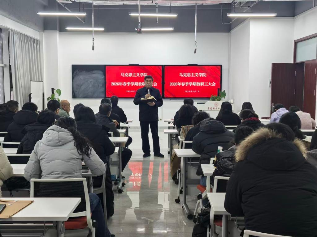 建设。他强调,为做好2026年工作,要着力在五个方面下功夫。一要强化党建引领,推动党建与业务工作深度融合、同频共振,坚决筑牢意识形态安全和校园安全稳定防线,为发展提供坚实保障。二要以《中共中央关于制定国民经济和社会发展第十五个五年规划的建议》为遵循,结合学院实际,坚持群策群力,科学制定并实施学院“十五五”事业发展规划。三要始终聚焦立德树人根本任务,扎实推进思政课建设,创新思政课教学方式,着力打造思政育人的青大品牌,培养更多让党放心、爱国奉献、担当民族复兴重任的时代新人。四要围绕学科建设需求,一体化推进科研创新和学科建设,加大对党的理论创新阐释和宣讲力度,不断深化马克思主义理论学科建设内涵建设。五要多措并举,拓宽引才渠道、精准靶向引才,着力构建高层次人才与青年骨干并重的学术梯队,切实配优建强思政课教师队伍,夯实学院长远发展的人才根基。